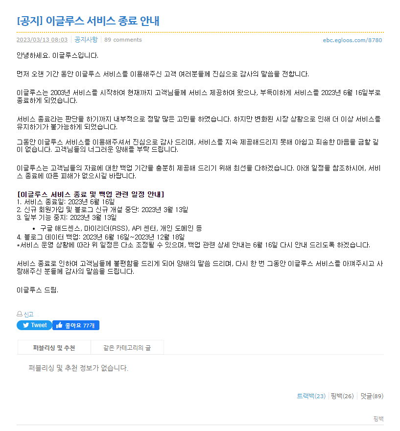 가장 아끼던 이글루스 블로그는 아예 없어져 버린다고 하고 있었고